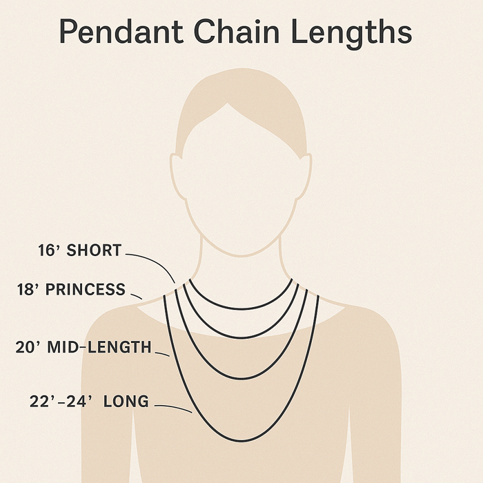 The chain you choose can completely change how your pendant looks, feels, and moves when worn. Standard lengths range from 16 inches (choker) to 24 inches (rope), with the most popular option being the 18-inch princess length, which typically rests just below the collarbone and flatters almost every neckline.